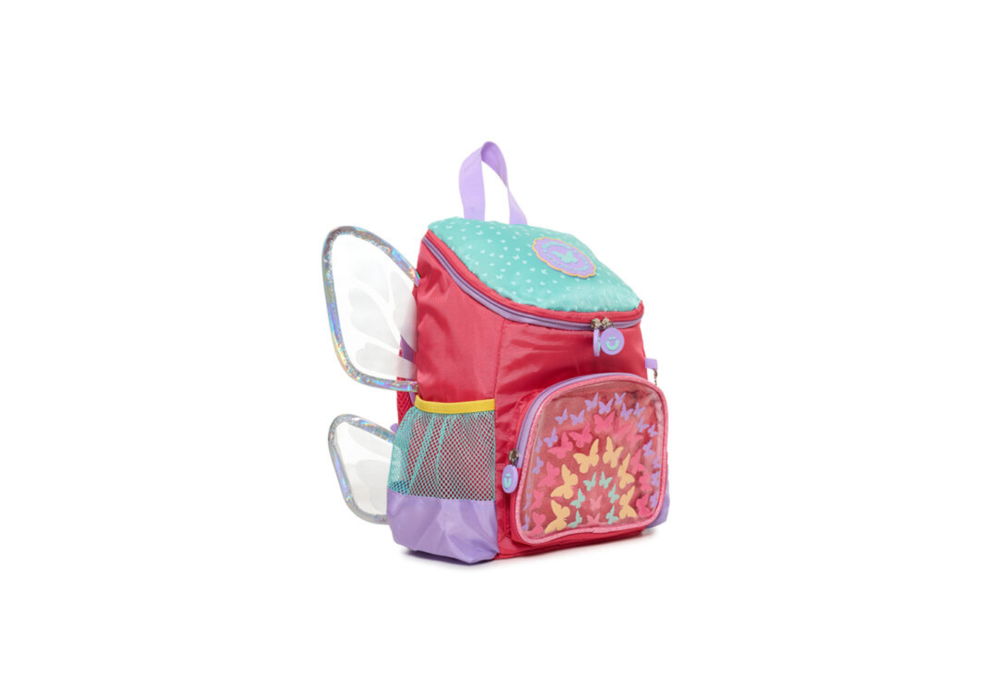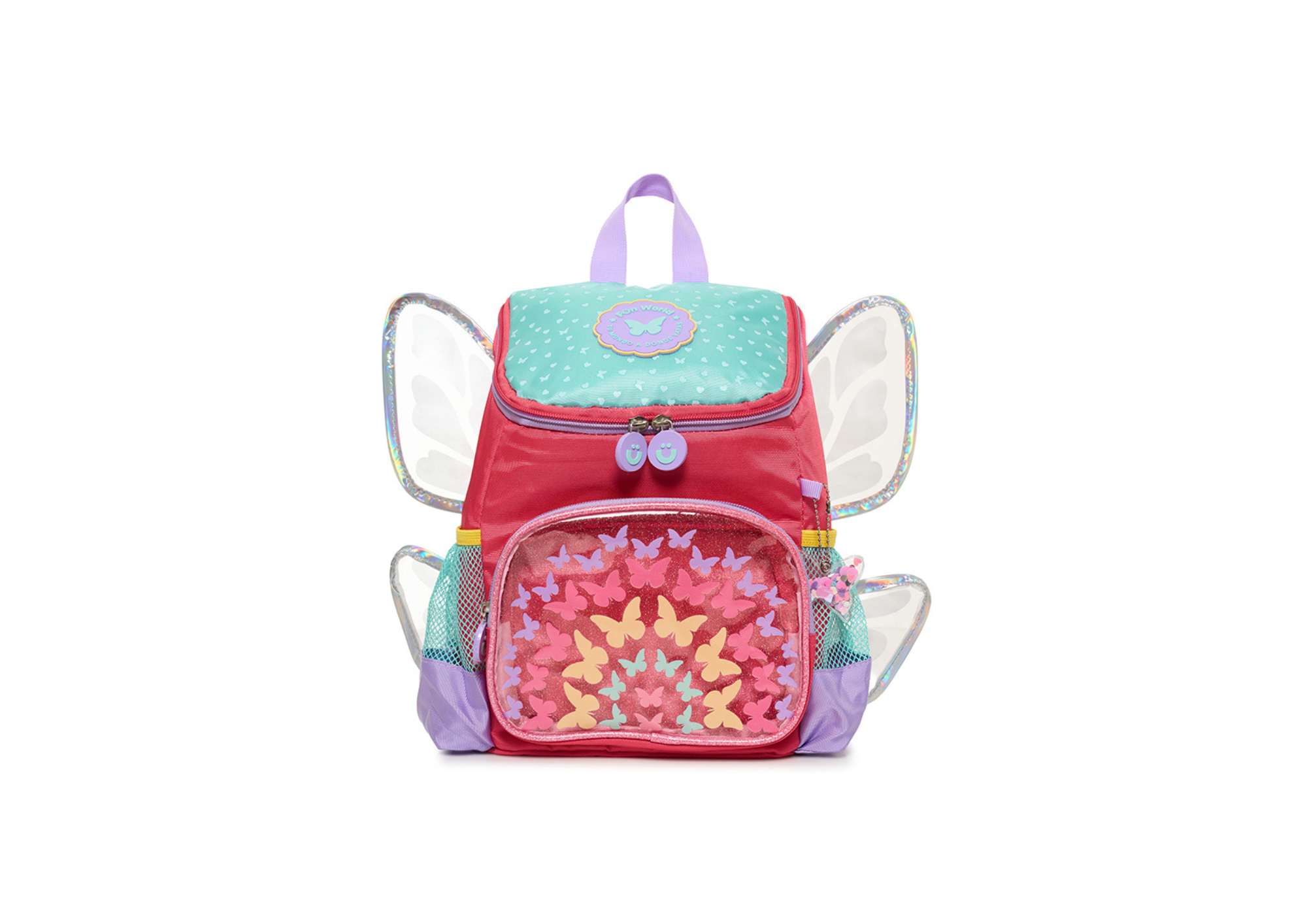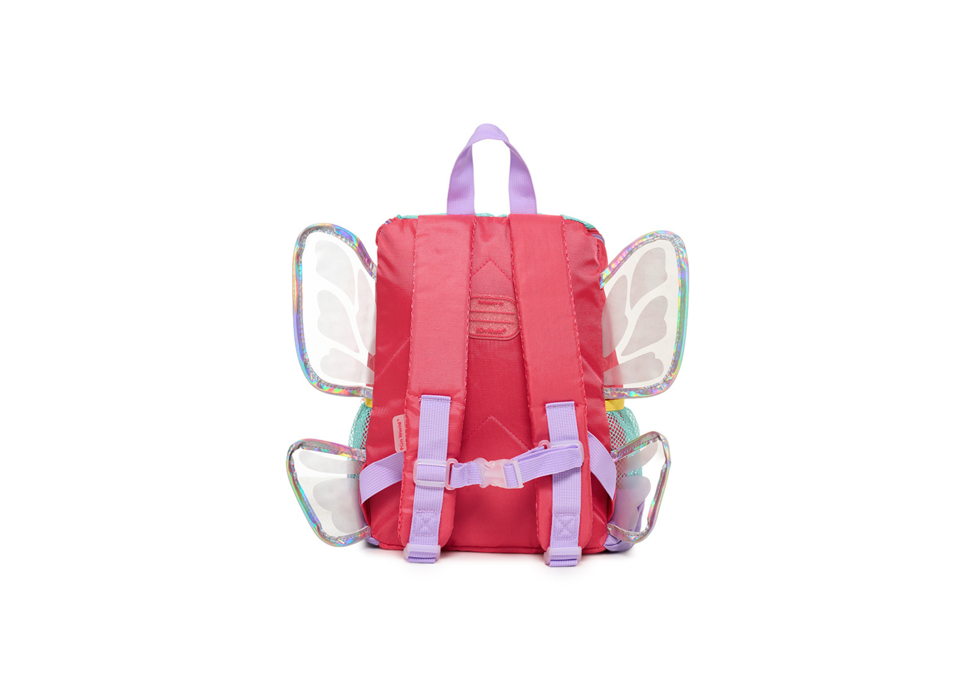 Diseño alegre y detalles brillantes, es perfecta para los más chicos. Presenta alas de PVC con borde holográfico, accesorio colgante y bolsillo frontal de PVC. Además, cuenta con dos bolsillos laterales con red para colocar botellas. Tiene correa de pecho ajustable, que ofrece mayor sujeción y comodidad para los más pequeños.